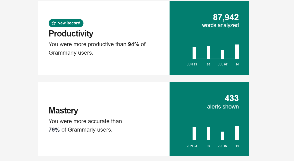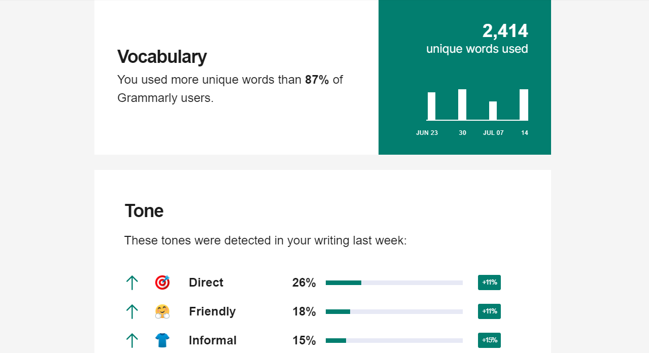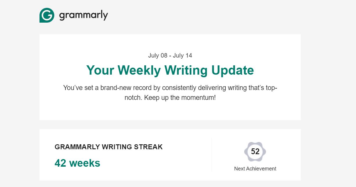 So about a year ago, 42 weeks ago to be exact, I added Grammarly to my browser to catch grammar issues, particularly in my more academic writing because it will underline contractions and send me weekly updates on my writing. Here are my stats from this last email: